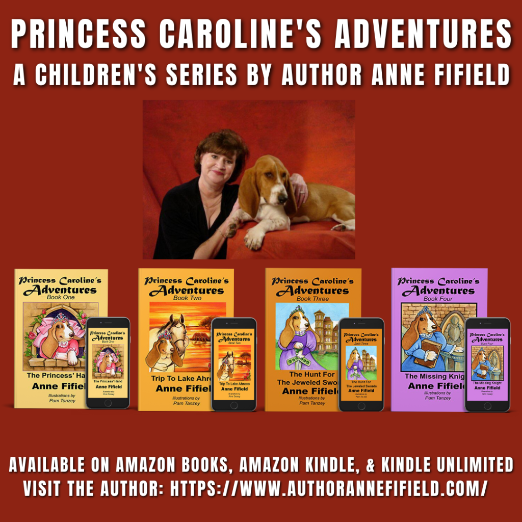 Well, Cat happened to chat by phone with our fabulous children’s author and writer, Mrs. Anne Fifield, and the bassets Piper and Finny not too long ago. Anne told me she is feverishly working on finishing the fifth book of her ‘Princess Caroline’s Adventures’ series.